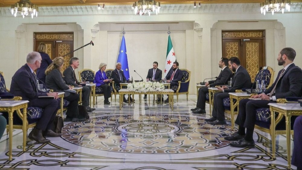 بحث الرئيس السوري أحمد الشرع، الجمعة، مع رئيسة المفوضية الأوروبية أورسولا فون دير لاين، ورئيس المجلس الأوروبي أنطونيو كوستا، في العاصمة دمشق، أهمية الحفاظ على وحدة الأراضي السورية، وسبل تطوير علاقات التعاون، فيما أعلن الاتحاد الأوروبي عن حزمة دعم مالي لدمشق بقيمة نحو 620 مليون يورو لعامي 2026 و2027.