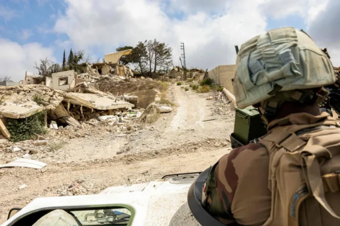 آلية عسكرية لـ«اليونيفيل» تسير قرب منازل مدمرة في كفر كلا بجنوب لبنان (أ.ف.ب)