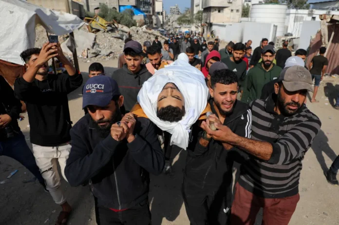 مشيعون يشاركون في جنازة الشاب الفلسطيني أحمد الهواري الذي قُتل بنيران إسرائيلية في مدينة غزة (رويترز)