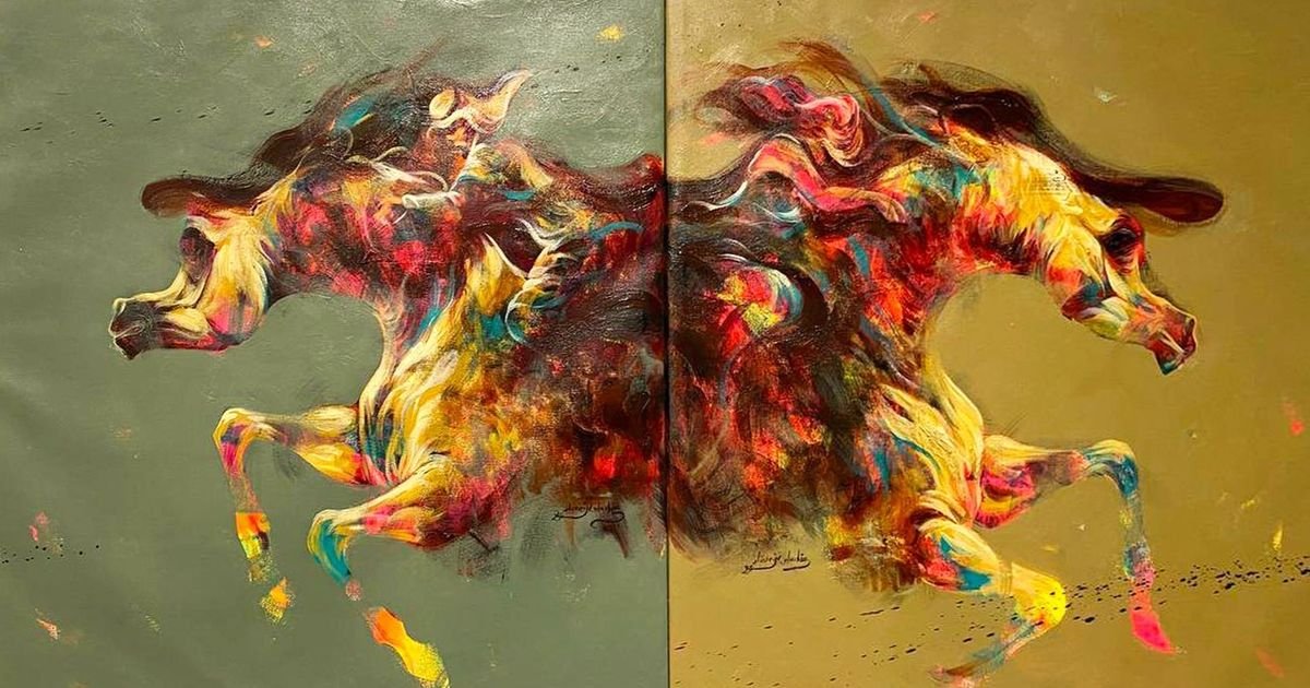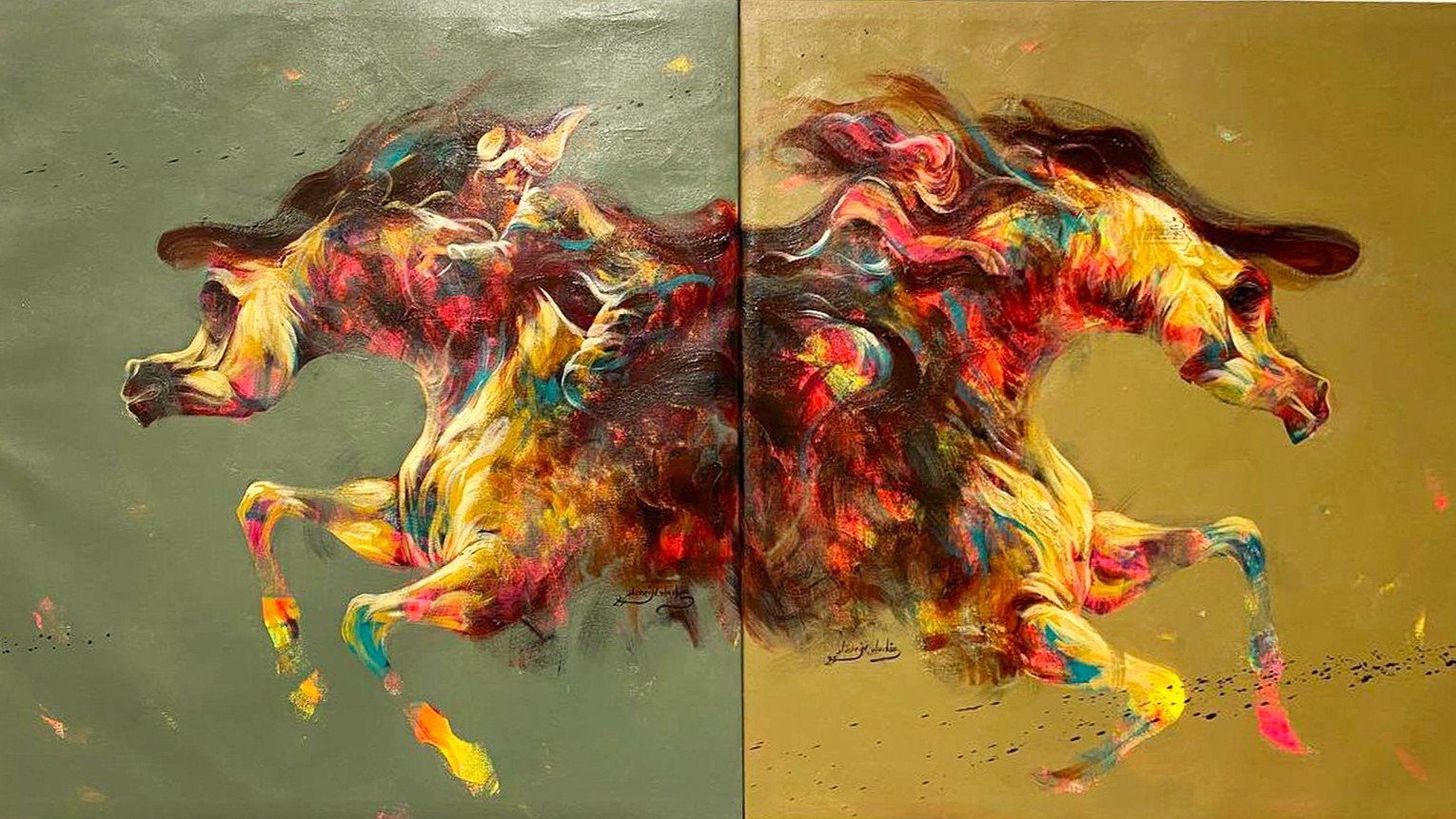 هذا التداخل يخلق تكويناً بصرياً يخرج من إطار الواقعية المباشرة، نحو بعد كوني أكثر رحابة، حيث تبدو اللوحة أشبه بمجرّة لونية متدفقة الحركة، وفي قلب هذا المشهد، تظهر الخيول مثل شٌهب عابرة، تولّد تموّجات متناغمة يستقبلها المتلقي كما لو كانت مقطوعة موسيقية، تُعزَف بالألوان ويتم تلقيها بالبصر والوجدان.