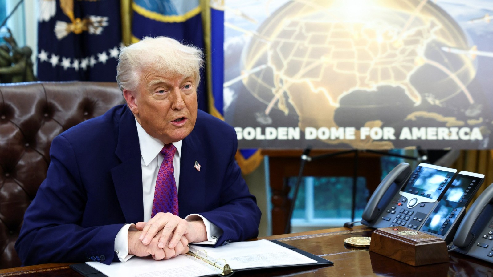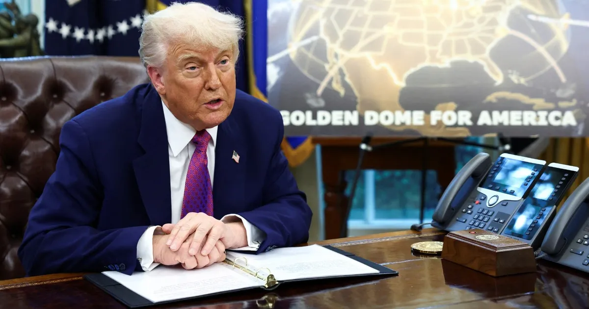 وخلال مؤتمر صحافي، جلس ترمب إلى جانب ملصق يُظهر خريطة الولايات المتحدة مطلية باللون الذهبي مع رسومات فنية لاعتراض صواريخ، وقال إن “هذا التصميم سيتكامل مع قدراتنا الدفاعية الحالية، وسيكون جاهزاً قبل نهاية ولايتي، أي في غضون 3 سنوات ستكون القبة قادرة على اعتراض الصواريخ، سواء أُطلقت من مسافات بعيدة، أو من الفضاء”.