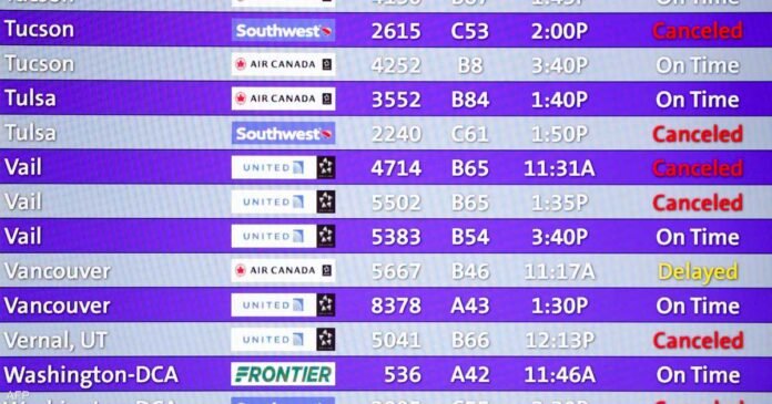 وألغيت 1191 رحلة على الأقلّ، مع تأخير 3974 أخرى، وفق بيانات موقع “فلايتاوير” (FlightAware) لغاية الساعة 18,00 بتوقيت غرينيتش من مساء الجمعة.