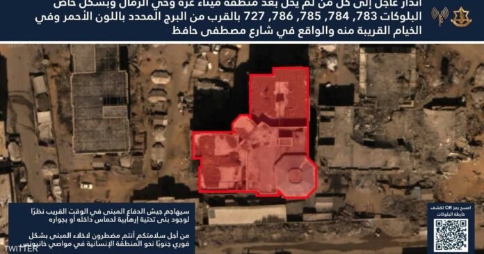 وأضاف البيان “من أجل سلامتكم أنتم مضطرون لاخلاء المبنى بشكل فوري جنوبًا نحو المنطقة الإنسانية في المواصي”.
