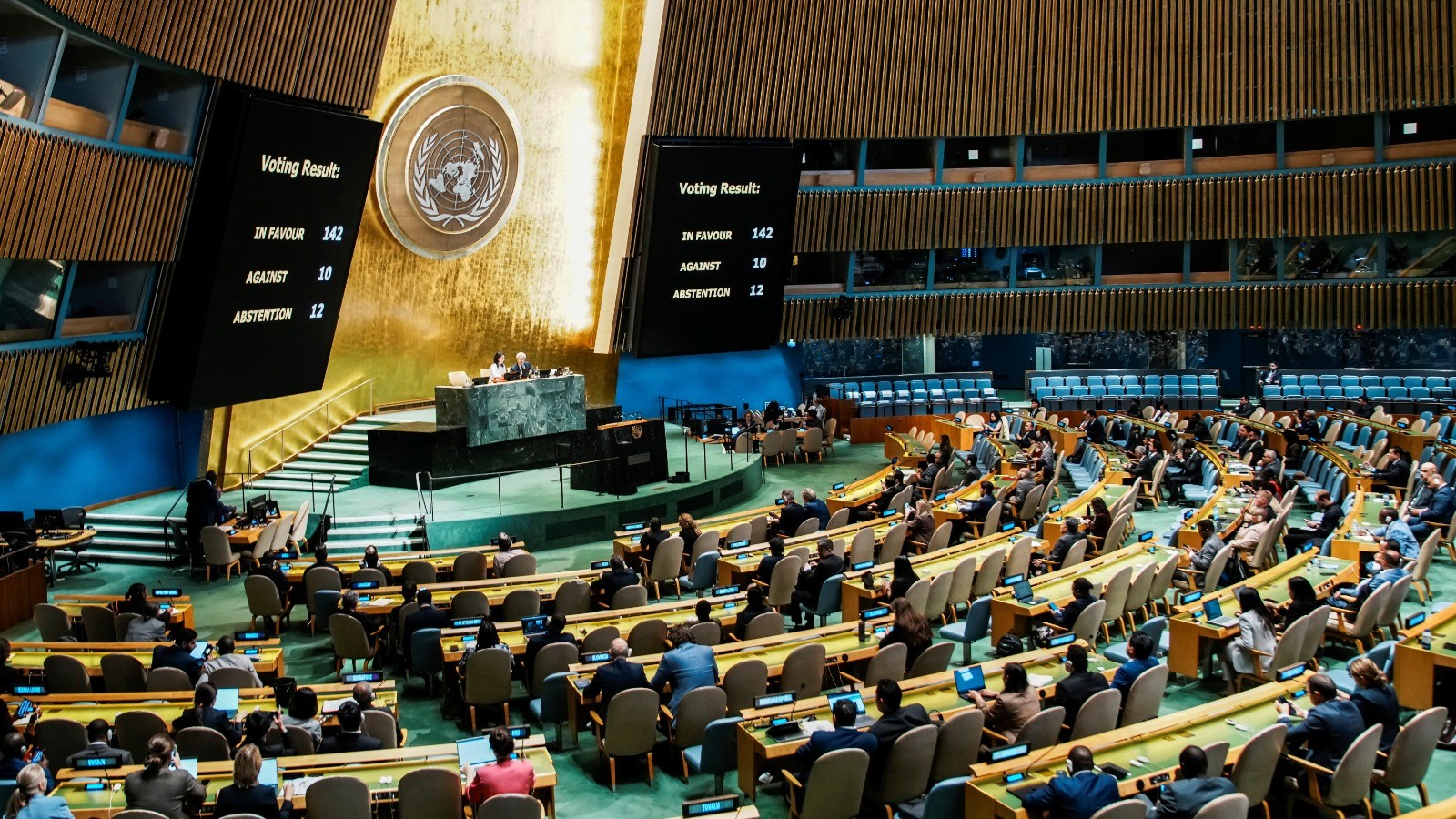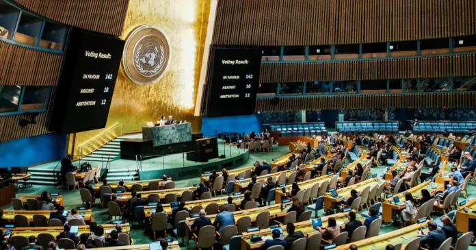 وصوتت الجمعية العامة للأمم المتحدة على إعلان يحدد خطوات ملموسة نحو حل الدولتين بين إسرائيل والفلسطينيين، وذلك بأغلبية 142 صوتاً، مقابل معارضة عشر دول بينما امتنعت 12 دولة عن التصويت.