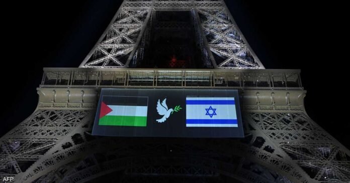 ما هو فيديو.. برج إيفل يضيء بالعلمين الفلسطيني والإسرائيلي؟