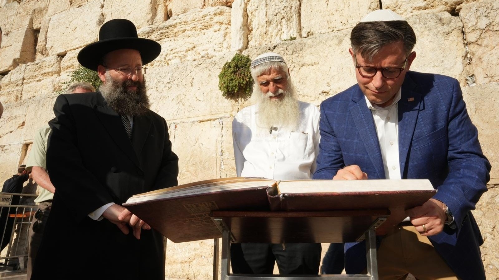 ما إن انتهى رئيس مجلس النواب الأميركي مايك جونسون من صلاته عند قاعدة حائط البراق، التف إلى الحضور مشيراً إلى أن زيارته تتزامن مع إحياء اليهود لذكرى دينية تتمثل في تدمير “الهيكل القديم” المزعوم. وبحضور مسؤولين ورجال دين إسرائيليين، قال النائب الجمهوري من ولاية لويزيانا “دعاؤنا أن تقف أميركا دائماً إلى جانب إسرائيل، ومن أجل الحفاظ على القدس وسلامها”.