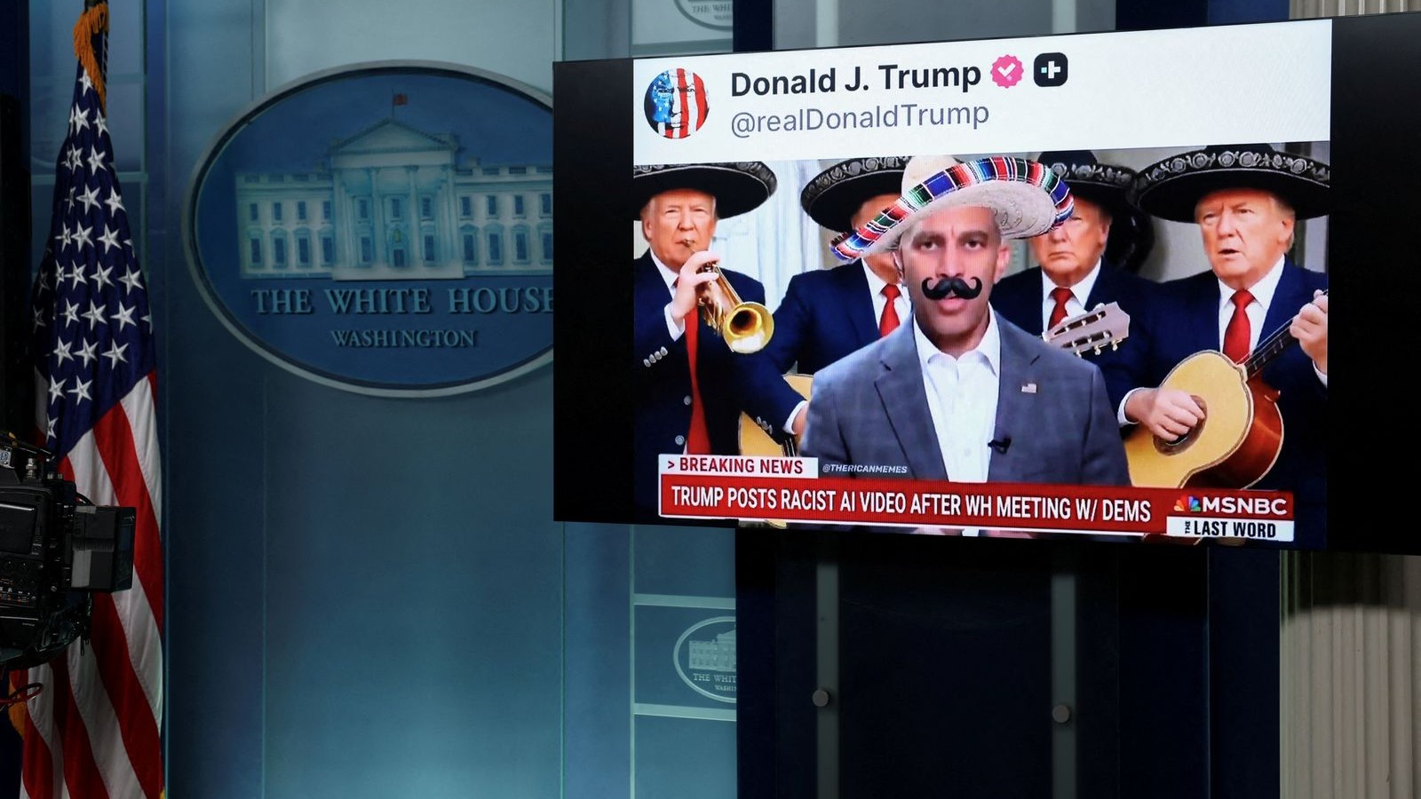 ونشر ترمب الاثنين، مقطع فيديو على حسابه على منصة تروث سوشيال يصور جيفريز وهو يتحدث خارج البيت الأبيض بشارب كثيف وقبعة مكسيكية وموسيقى المارياتشي في الخلفية. وجيفريز من أصحاب البشرة السوداء وتعود أصول والدته إلى الرأس الأخضر.